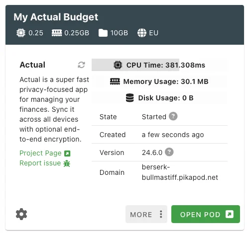 Using PikaPods is also a simple way to support the development of Actual Budget, as PikaPods will share some of its revenues with Actual for customers using their Actual Budget Pods.